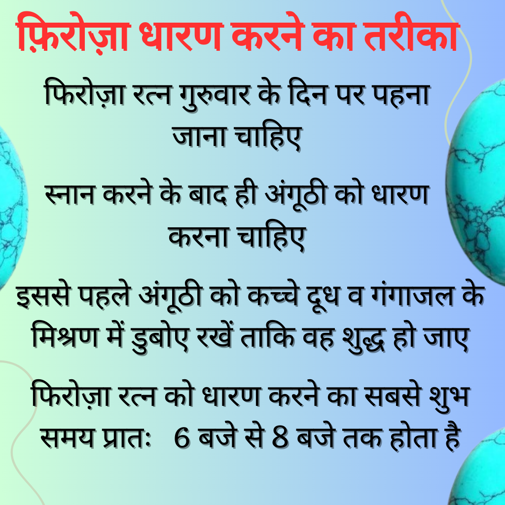 -इस रत्न को धारण करने से पहले इसे अभिमंत्रित करना बहुत ज़रूरी है. इसके लिए सबसे पहले दूध और गंगाजल के मिश्रण में फिरोजा को डालकर शुद्ध कर लेना चाहिए.