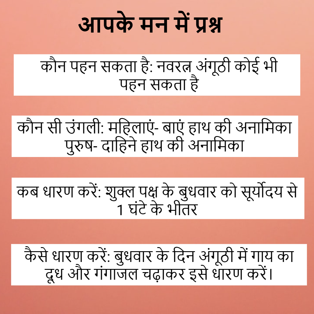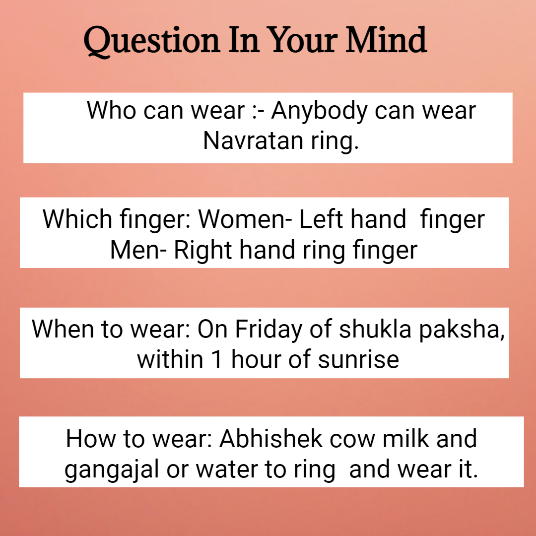 *जिस जातक की कुंडली में कोई भी ग्रह अशुभ या नीच स्थान में हो और किसी प्रकार का कोई लाभ ना हो रहा हो तो नवरत्न अंगूठी धारण करना चाहिए।