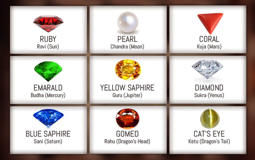 People can select these auspicious stones based on their zodiac signs or horoscope. Different gemstones are depending on different planets such as Ruby or Manikkam represents Sun, Pearl or Muktaphalam represents Moon, Red coral or Moonga represents Mars, Emerald or Maratakam represents Mercury, Yellow sapphire or Pusparajam represents Jupiter, Diamond or Vajram represents Venus, Blue sapphire or Neelam represents Saturn, Hessonite or Gomedh represents Rahu and Cat's eye or Vaiduryam represents Ketu.
